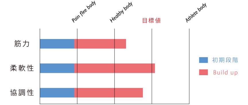 実際には、目標値までの積み重ねが必要になりますが、3つのバランスの中で特に改善が必要なところに施術やトレーニングを集中することで早期に痛みが改善することがあります。ただし、それは一時的なものと捉えています。その痛みの改善からさらにbuild-upすることで、日常生活で感じる痛み、スポーツ動作で感じる痛みが改善していきます。ここで注意する点は、身体の特定の場所ばかりをbuild-upしていては、改善効果の挙がらない方もいらっしゃいます。そのような方には、全身の動作確認による全身の評価というものが必要になってきます。